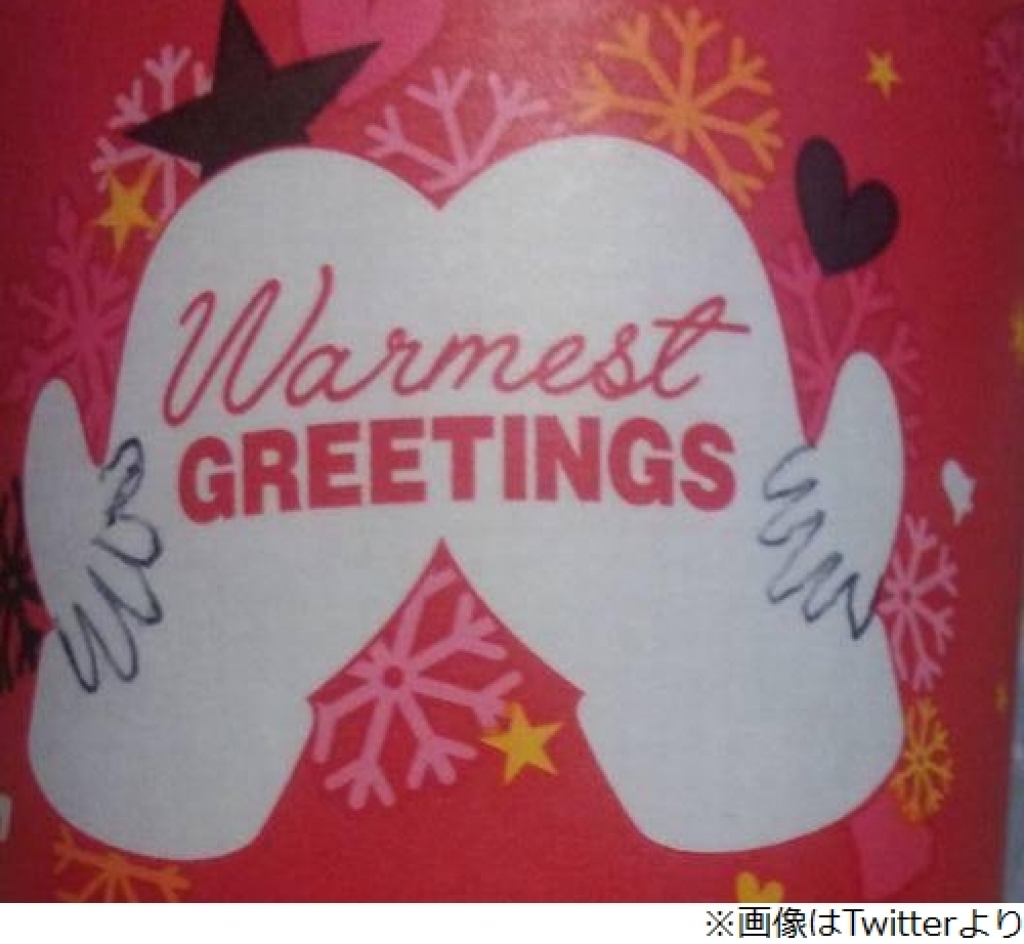 カップは、赤い背景に白の手袋とクリスマスにちなんだ雪の結晶模様のデザインですが、手袋の親指部分に指を書くと、お尻をこちらに向けているように見えるとして、多くの人たちに拡散されれいるとのこと。