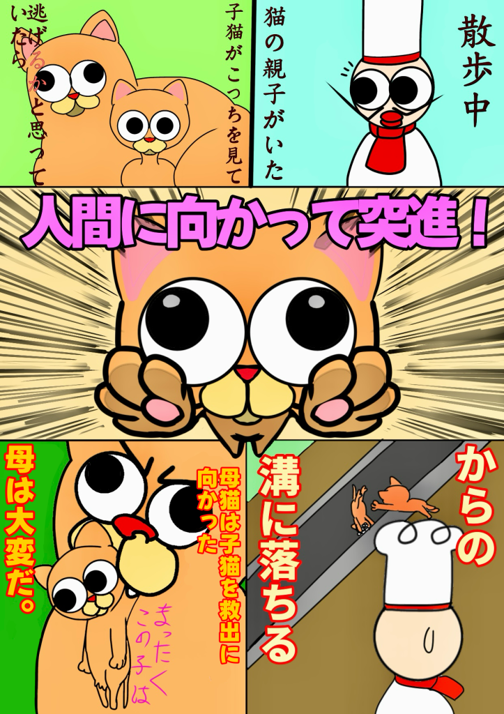 その跡を追うように母猫も溝の中へと入っていった。子猫は怪我もなく無事、母猫に救助され、そのまま別の休憩場所へと向かっていった。母猫も大変だ。